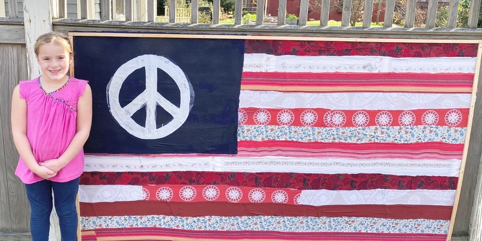 Made from fabric scraps, an American Flag with peace at its core. Stands 4’ x 8’. I made one about 10 years ago when this country needed some serious peace and here we are again. It was displayed on my neighbors fence on Bay Road for several months and we had so many people comment on how beautiful it was and how it gave some a sense of hope in challenging political times. I feel like it’s time to recreate an improved model and would love to see it displayed somewhere more central in Hamilton Wenham though my neighbor would most likely be willing to display again.