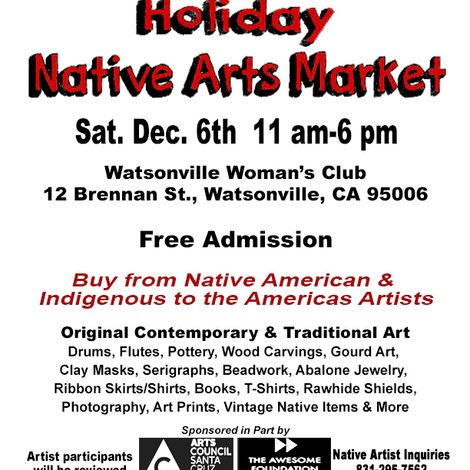 My plan is to offer a market of Native American/Indigenous to the Americas artisans, including myself. I’m hoping to have 6-10 other Native vendors who create traditional and contemporary art and craft. In this category there are few events that are focused on Native American and Indigenous arts in this community. This market would serve the purpose of supporting indigenous artists as well as offering the community the opportunity to experience and learn about this culture and its art. This county offers few opportunities in this cultural category. I believe the community would greatly welcome an event like this. It will be free and open to the public and appropriate for all ages. Plan to have on Dec 6, 11-6pm at the Watsonville Women's Club. Due to my experience in publicity and the publication industry, local papers have expressed interest in giving my event free coverage, which will compliment any paid advertising. They are interested because no one has planned a market like this. I will also be posting the event on several social media sites and online event websites.