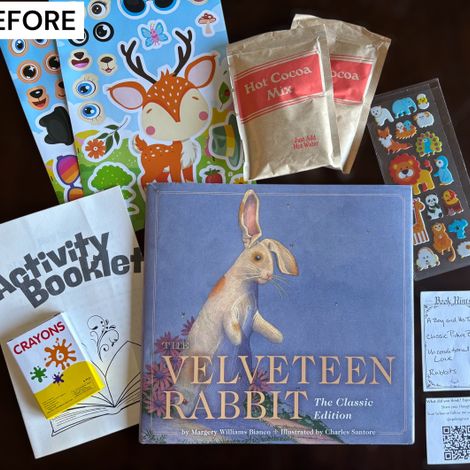 To stand out among similar product lines, the Bundles are designed for all ages, including age-appropriate items that complement the book. For example, a kid's picture book like The Velveteen Rabbit would include crayons, stickers, art kits, and an activity book. This activity book, made up of rabbit-themed coloring pages, drawing and writing prompts, will encourage the young reader to engage with the story beyond its pages.