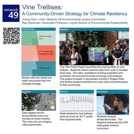 The project is an outgrowth of ongoing environmental justice efforts at the Jordan School location. The initial component was the Network 49 Vine Trellis Project, in which students quantify the reduction of heat load on buildings by shading the walls. The second component was stormwater retention by adding contours to perennial beds. Both techniques are inexpensive, easy to implement, and flexible. They can be adapted to diverse locations and needs.